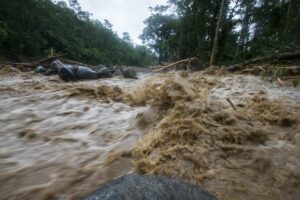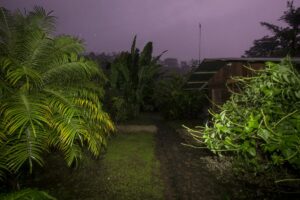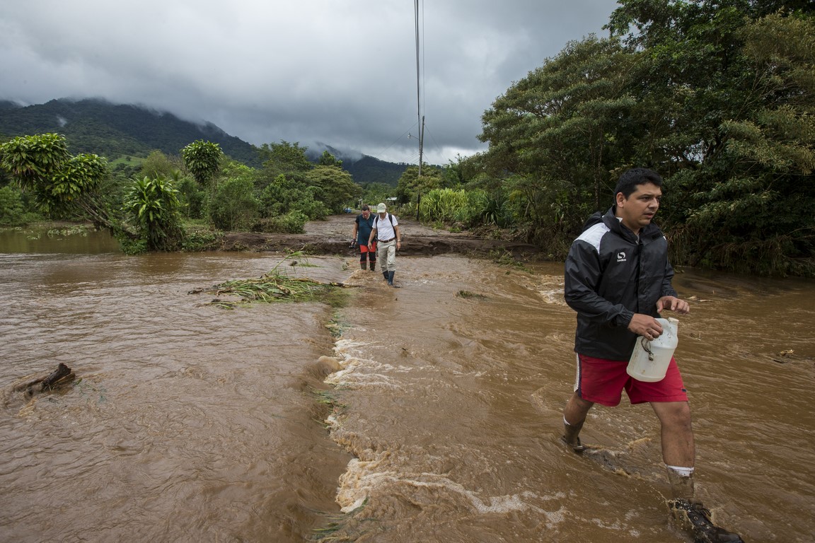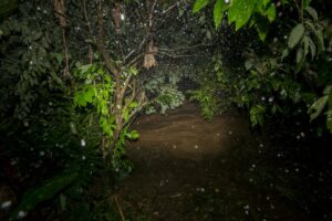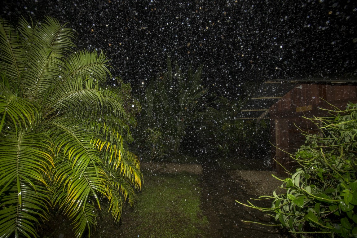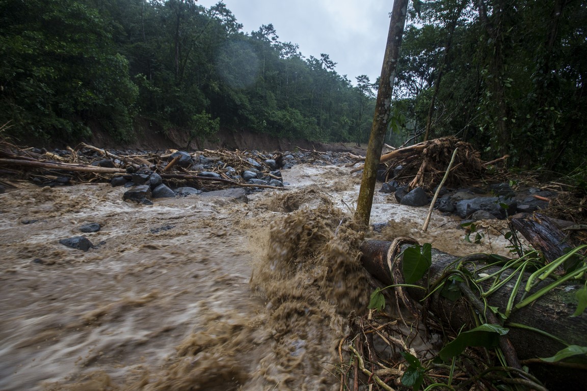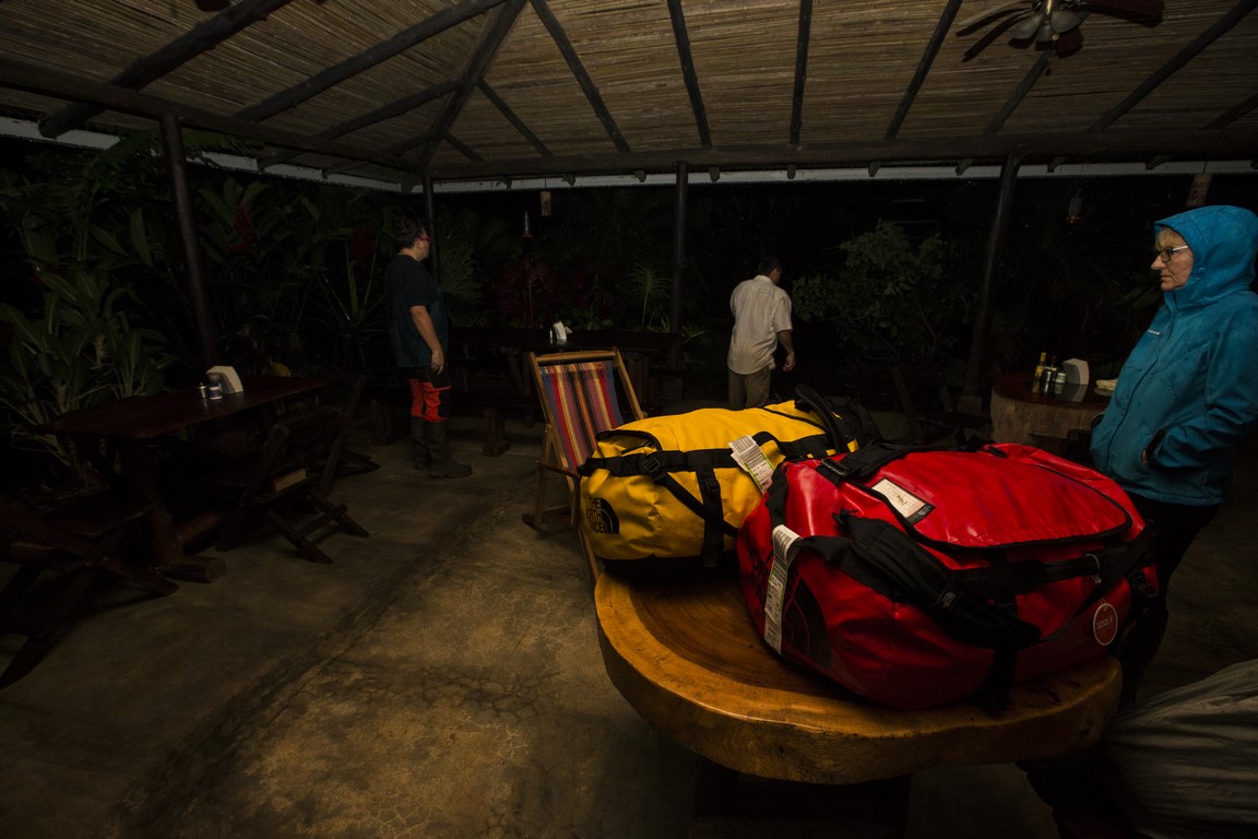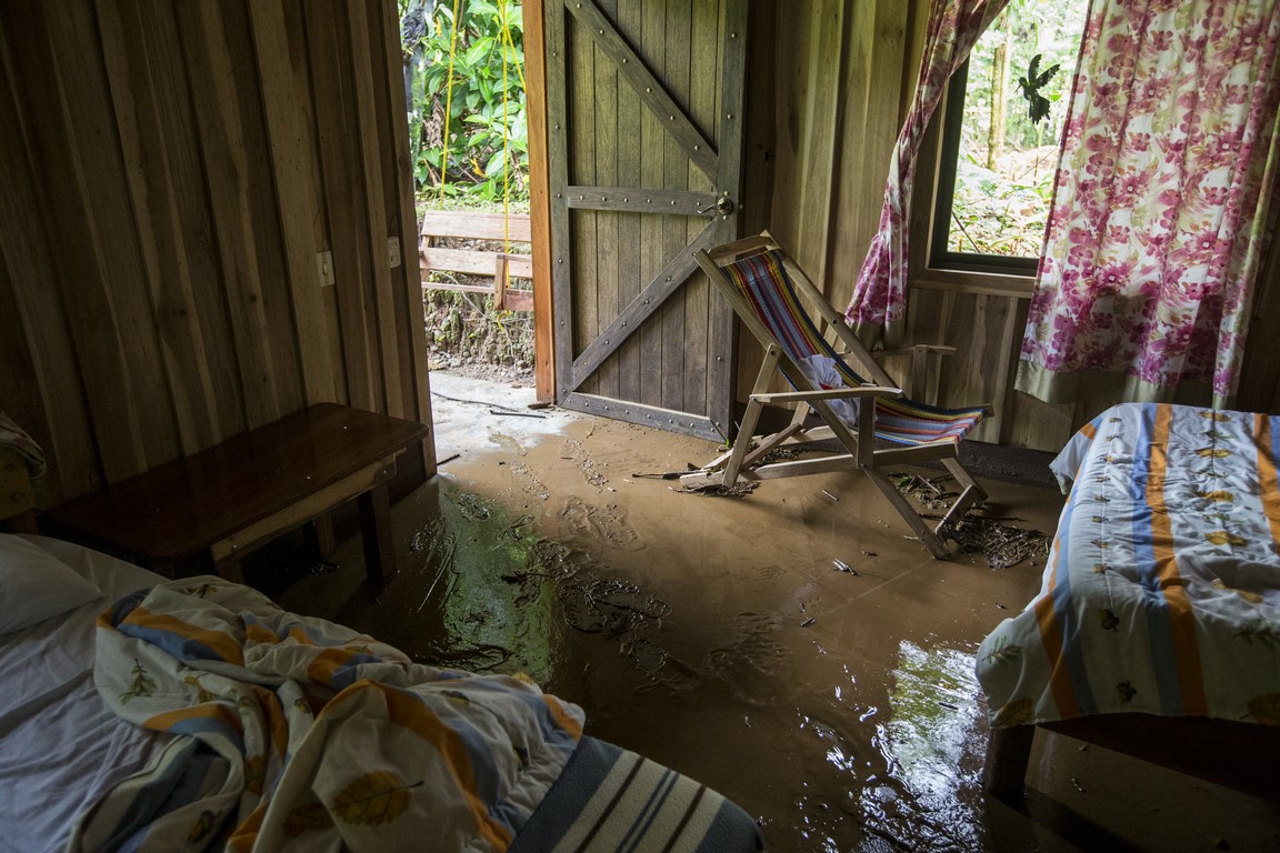 Le décalage et la fatigue aidant, nous nous couchons tôt, mais la pluie a doublé d’intensité. Le propriétaire des lieux nous annonce 4 à 5 heures de pluie, inutile de s’inquiéter. 17h30 il fait presque nuit noire, la pluie s’intensifie encore j’ai l’impression qu’un jet d’eau est restée allumée sur le toit en taule du chalet. Les fossés se remplissent et commencent à déborder par endroit, un peu d’eau s’amoncèle devant la porte. Nous décidons de nous coucher pour récupérer de la journée et du décalage horaire. 18h30 l’eau s’accumule devant la cabane, le vent s’en mêle et un bruit impressionnant émerge de la rivière située à 25 mètres de notre chalet. La pluie s’intensifie encore et encore et le bruit de la rivière avec, comme si nous étions pris dans le rouleau d’une énorme vague, les murs de la cabane commencent à vibrer, on entend des arbres tomber. A ce moment de la nuit, on ne veut pas y croire, ce n’est pas possible, ça ne peut pas être autre chose que de la pluie. 19h le frère du propriétaire du Lodge frappe à la porte il hurle en espagnol et nous demande de venir nous réfugier dans la zone commune, lorsqu’il ouvre la porte l’eau et la boue envahissent le chalet, nous avons à peine le temps de mettre les chaussures, le chalet est inondé. Nous prenons nos affaires et courrons sous la pluie, en quelques mètres nous sommes trempés. Nous suivons Irwin dans la nuit noire suivis par le bruit assourdissant de la rivière, des arbres qui craquent et nous arrivons à la salle de restauration. C’est ici que nous attendrons que la tempête passe. Irwin hurle dans son téléphone pour obtenir des nouvelles de ses frères plus bas dans la vallée, il est à peine audible car sa voix est couverte par le fracas des arbres et le vacarme de la rivière, nous entendons des rochers dévaler, d’autres arbres se casser et plus les minutes avance plus un bras de rivière se rapproche de l’endroit où nous sommes. Chaque fois que nous l’éclairons à la frontale il a progressé de quelques centimètres. L’eau passe à une vitesse folle et nous commençons à envisager le pire. Les éclairs illuminent le ciel, à peine visible sous les trombes d’eau, pris par la fatigue je finis par m’endormir sur ma chaise. 22h la pluie s’est calmée. Nous sommes accompagnés vers un autre chalet, un peu plus à l’abri, où nous arrivons à dormir quelques heures.