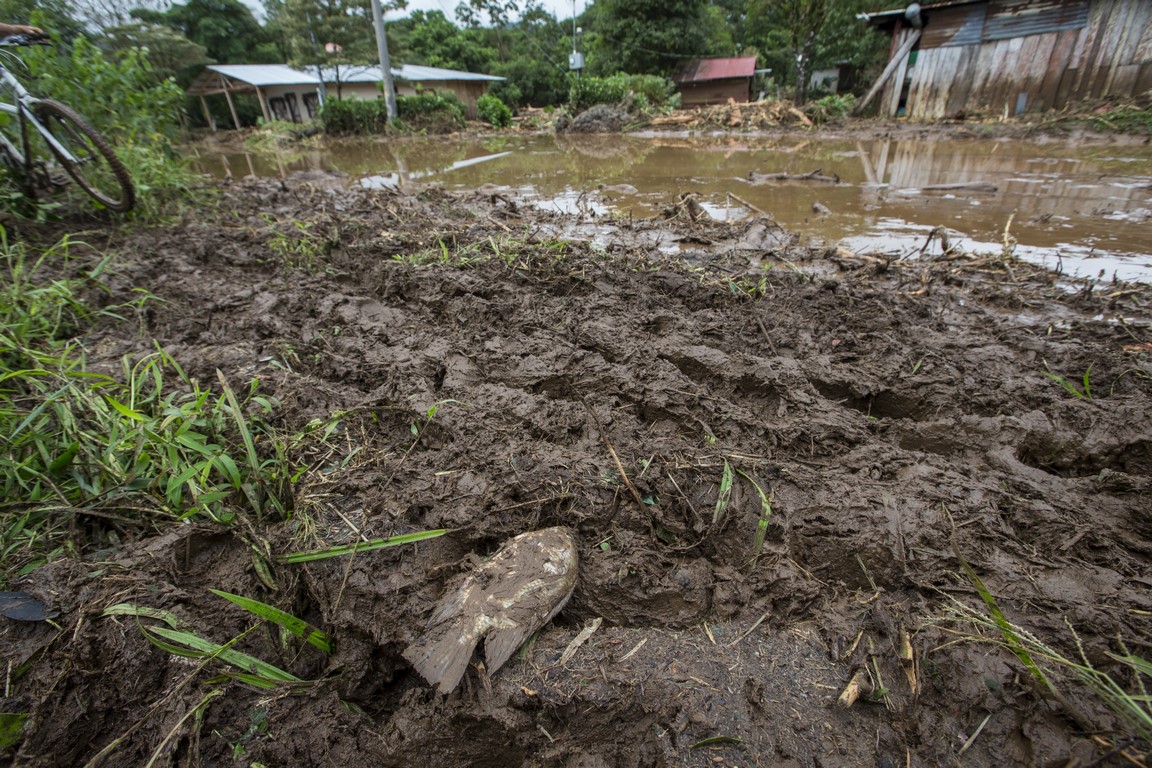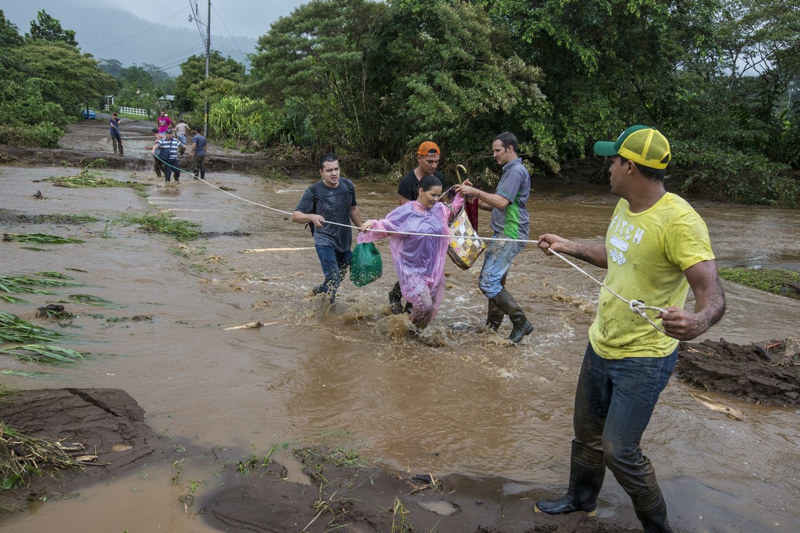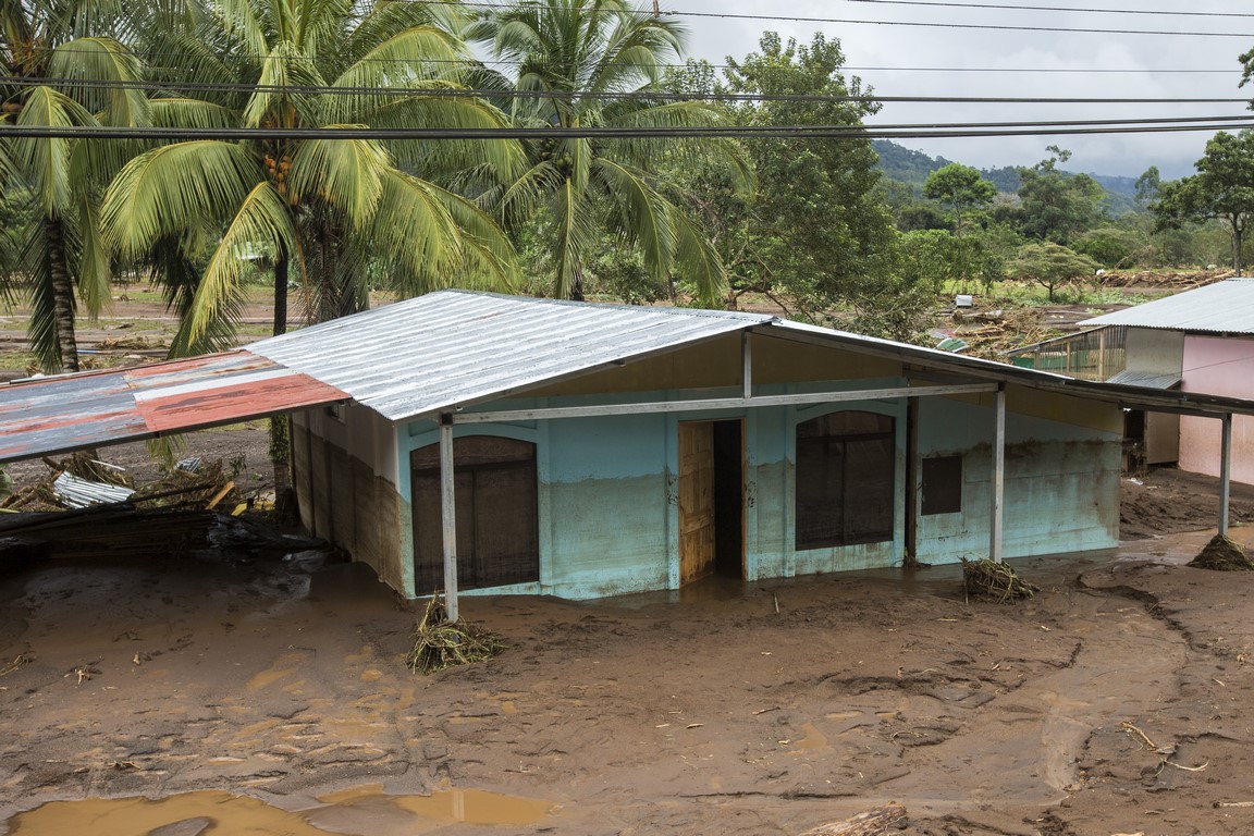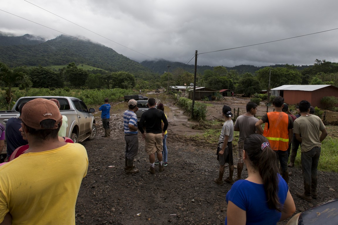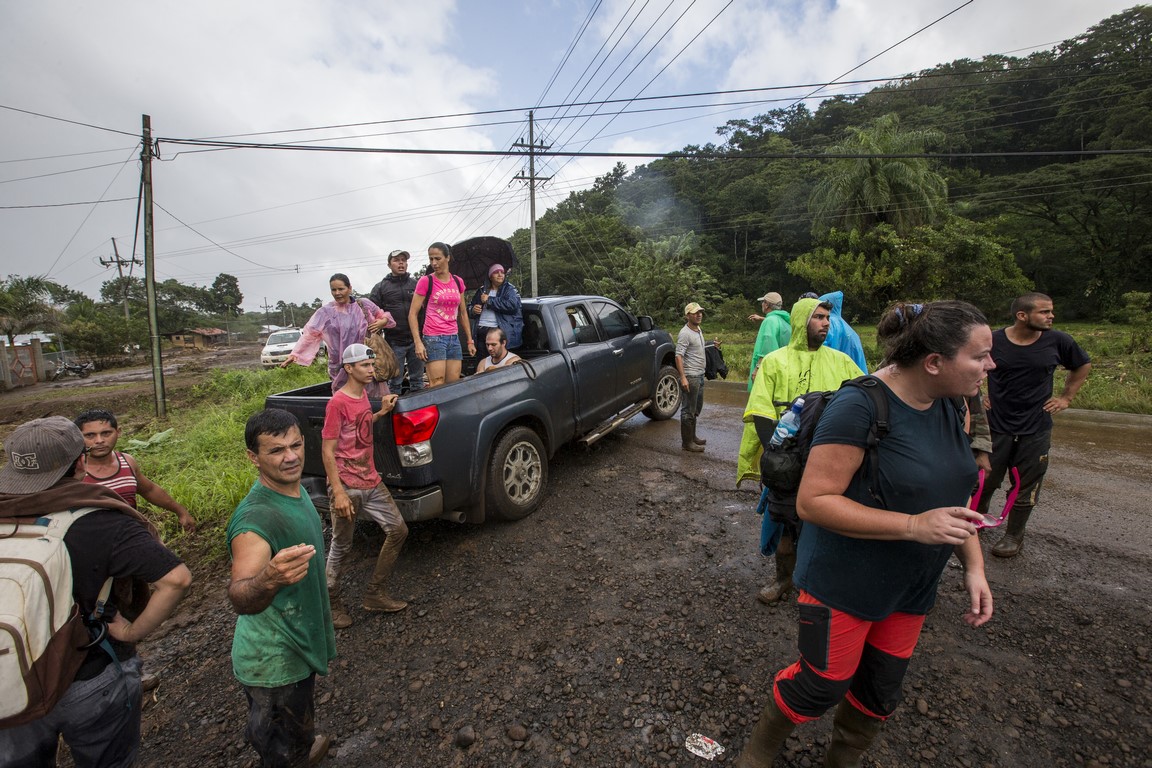 Revenus là-haut, Carla, l’épouse du propriétaire nous prépare un repas mais à peine nous avons terminé l’assiette que Warner arrive à moto tout essoufflé et nous demande de prendre nos affaires rapidement et de partir en courant car les autorités annoncent l’arrivée d’une avalanche de boue. La montagne s’est gorgée d’eau et les terrains glissent çà et là dans la montagne, en entraînant tout sur leur passage. Nous repartons une nouvelle fois, mais en courant, sac à dos sur le dos et la peur au ventre. Arrivés en bas, près du passage de la rivière, des hommes nous font de grands signes, ils hurlent dans notre direction et nous demandent d’accélérer, des familles nous précèdent, des sacs poubelles remplis d’affaires à la main. Une corde est tendue pour nous aider à traverser la rivière. Je traverse en courant, appareil photo à la main. La précédente coulée de boue ne nous facilite pas le passage et nous nous enfonçons jusqu’aux genoux, l’ambiance est affreuse, tout le monde crie, hurle, il nous faut nous dépêcher. J’en croise certains qui se précipitent en courant pour alléger les bras de personnes effectuant la traversée. Dans la précipitation, une femme s’est enfoncé dans la boue quasiment jusqu’à la taille, deux Ticos viennent pour la secourir. Des hommes répètent « La cabeza, la cabeza » pour qualifier l’avant de la coulée. Je ne me retourne pas et cours aussi vite que je peux pour rattraper les autres plus loin devant moi. Nous arrivons de l’autre côté et rapidement nous sommes embarqués dans un pick-up, le conducteur nous dirige deux villages plus loin, dans un centre d’accueil pour sinistrés.