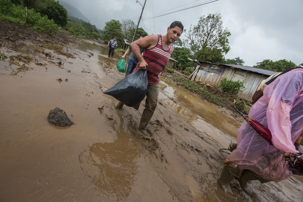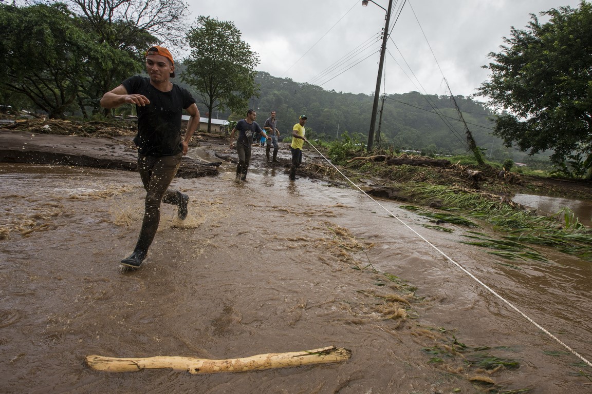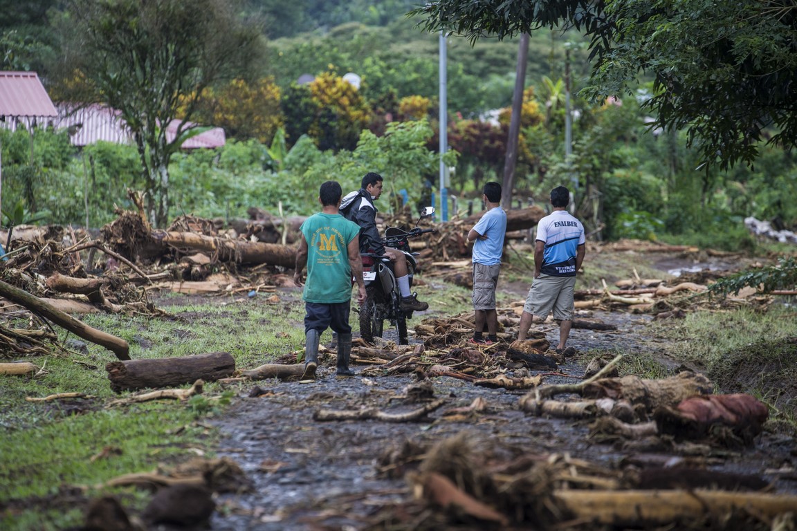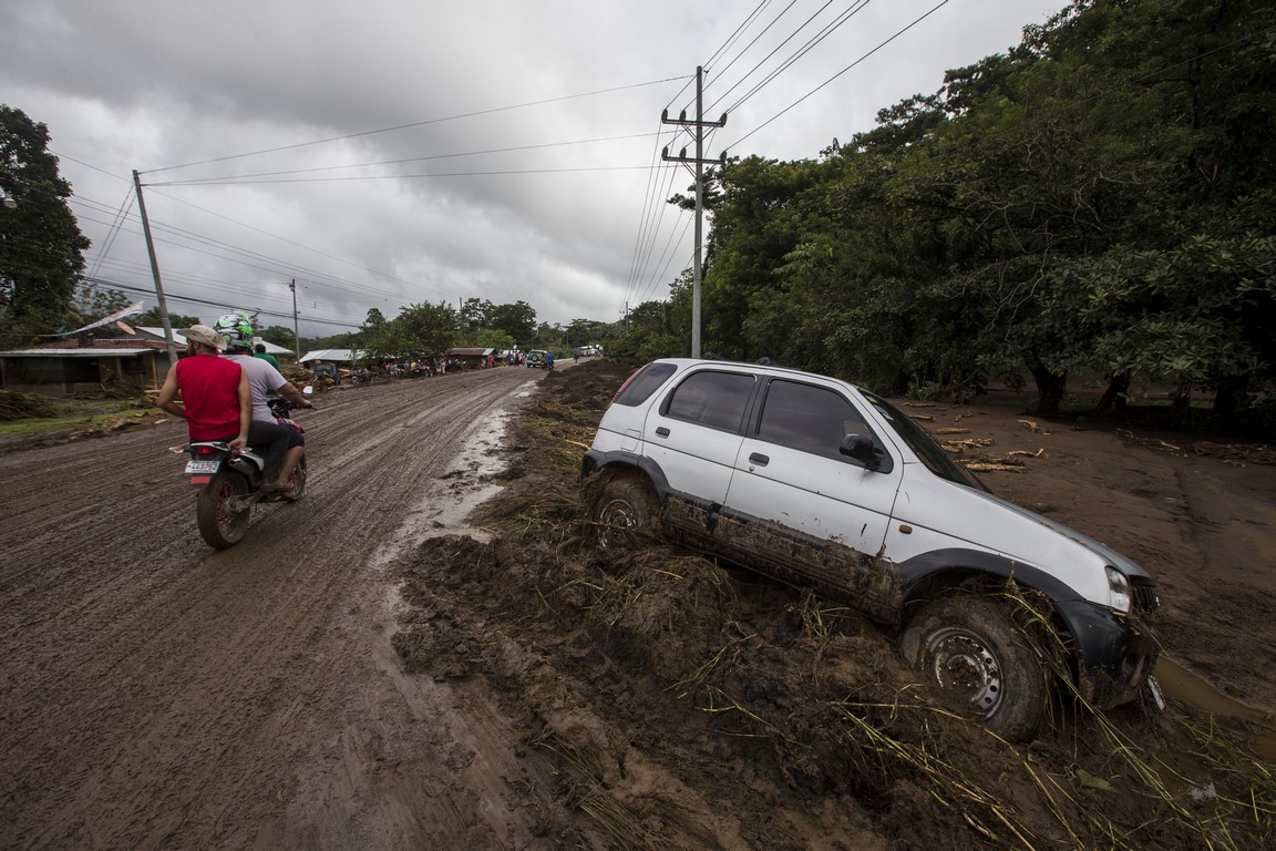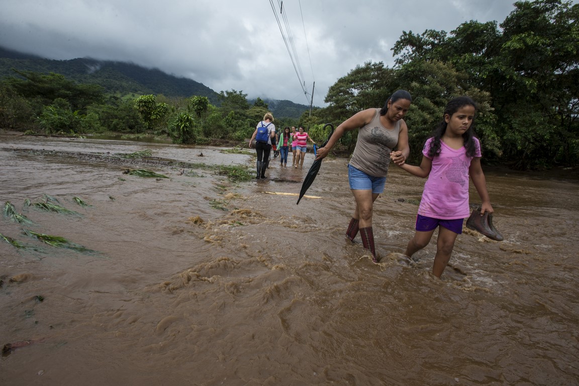 Revenus là-haut, Carla, l’épouse du propriétaire nous prépare un repas mais à peine nous avons terminé l’assiette que Warner arrive à moto tout essoufflé et nous demande de prendre nos affaires rapidement et de partir en courant car les autorités annoncent l’arrivée d’une avalanche de boue. La montagne s’est gorgée d’eau et les terrains glissent çà et là dans la montagne, en entraînant tout sur leur passage. Nous repartons une nouvelle fois, mais en courant, sac à dos sur le dos et la peur au ventre. Arrivés en bas, près du passage de la rivière, des hommes nous font de grands signes, ils hurlent dans notre direction et nous demandent d’accélérer, des familles nous précèdent, des sacs poubelles remplis d’affaires à la main. Une corde est tendue pour nous aider à traverser la rivière. Je traverse en courant, appareil photo à la main. La précédente coulée de boue ne nous facilite pas le passage et nous nous enfonçons jusqu’aux genoux, l’ambiance est affreuse, tout le monde crie, hurle, il nous faut nous dépêcher. J’en croise certains qui se précipitent en courant pour alléger les bras de personnes effectuant la traversée. Dans la précipitation, une femme s’est enfoncé dans la boue quasiment jusqu’à la taille, deux Ticos viennent pour la secourir. Des hommes répètent « La cabeza, la cabeza » pour qualifier l’avant de la coulée. Je ne me retourne pas et cours aussi vite que je peux pour rattraper les autres plus loin devant moi. Nous arrivons de l’autre côté et rapidement nous sommes embarqués dans un pick-up, le conducteur nous dirige deux villages plus loin, dans un centre d’accueil pour sinistrés.