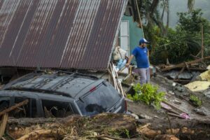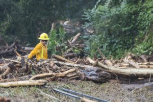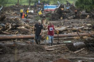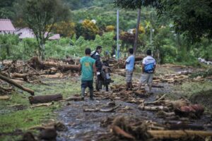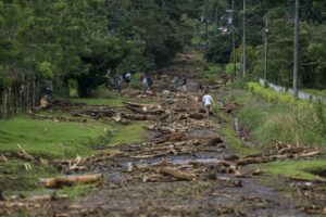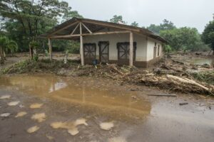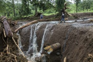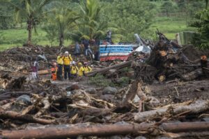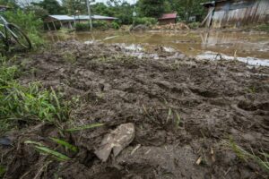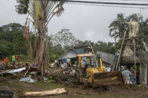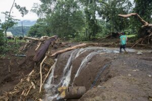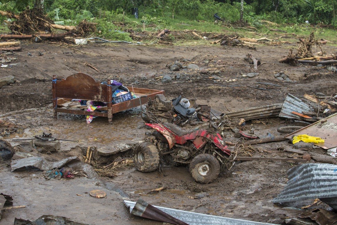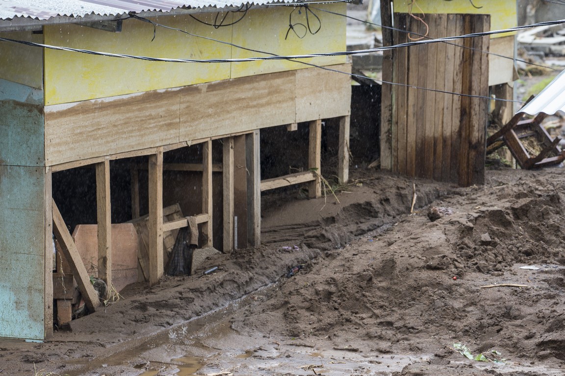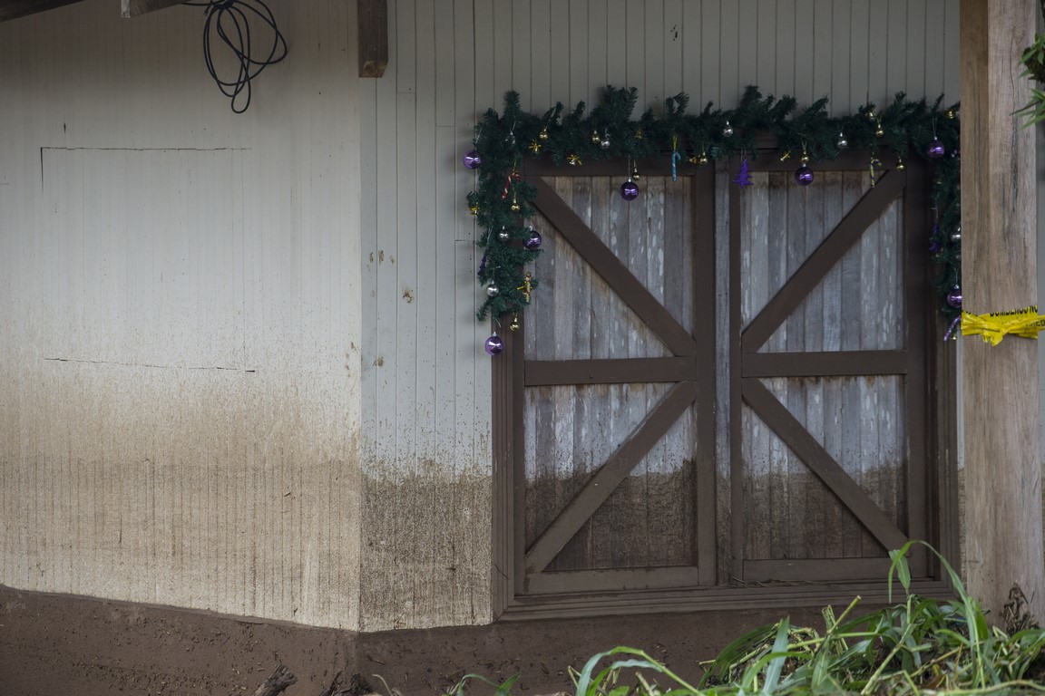 Sur le chemin, des rochers sont posés sur la piste qui, dans un virage, s’est effondrée, laissant un trou de plus de 8 mètres. Nous passons devant des maisons complètement inondées, remplies d’eau et de boue, des voitures ont été déplacées, des maisons partagées. Les habitants remercient Dieu de les avoir protégé, un homme joue avec ses filles, le sourire aux lèvres « ce n’est que matériel », les gens commencent à déblayer les devantures des maisons mais plus bas, après avoir traversé la rivière, c’est une vision d’horreur qui m’attend, sur notre route des rubans de police ont été tendus autour d’une maison en englobant le morceau de route noyé de boue. Dans ce qui était un jardin, des policiers extirpent le corps d’un enfant ensevelit sous près d’un mètre de boue et de morceaux de bois. Sa mère et lui ont été emportés par la coulée de boue sur un kilomètre depuis le haut de la colline. Leur maison a été coupée en deux. Ma gorge se noue.