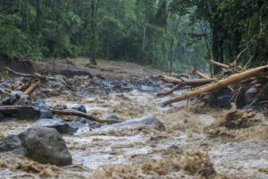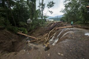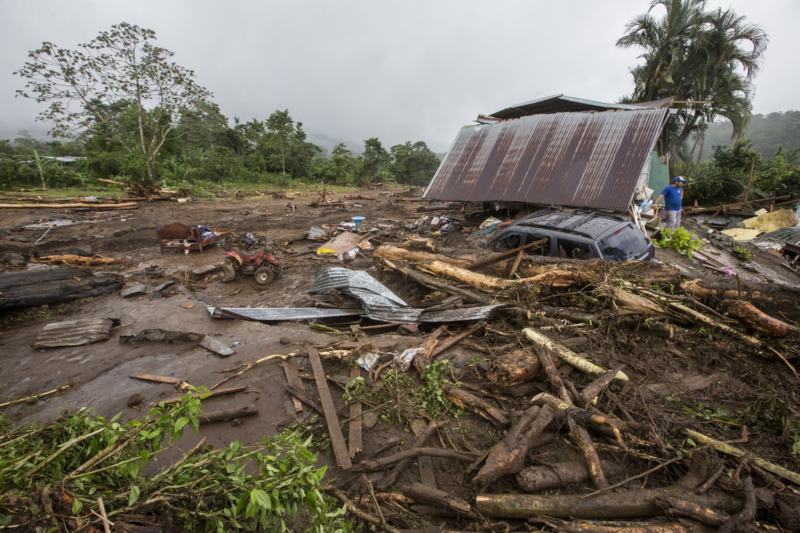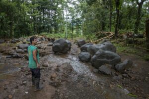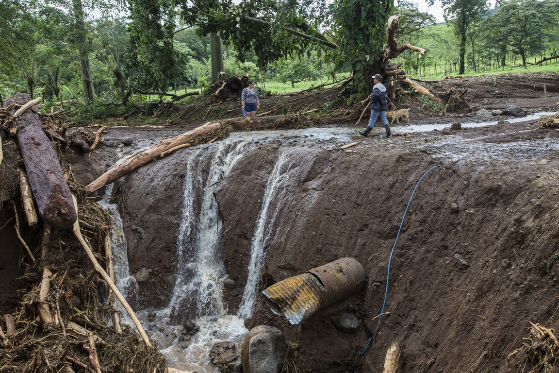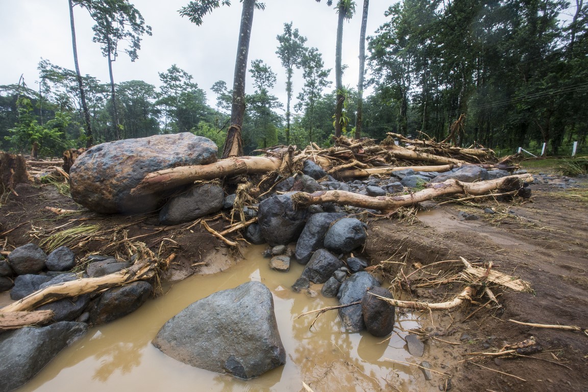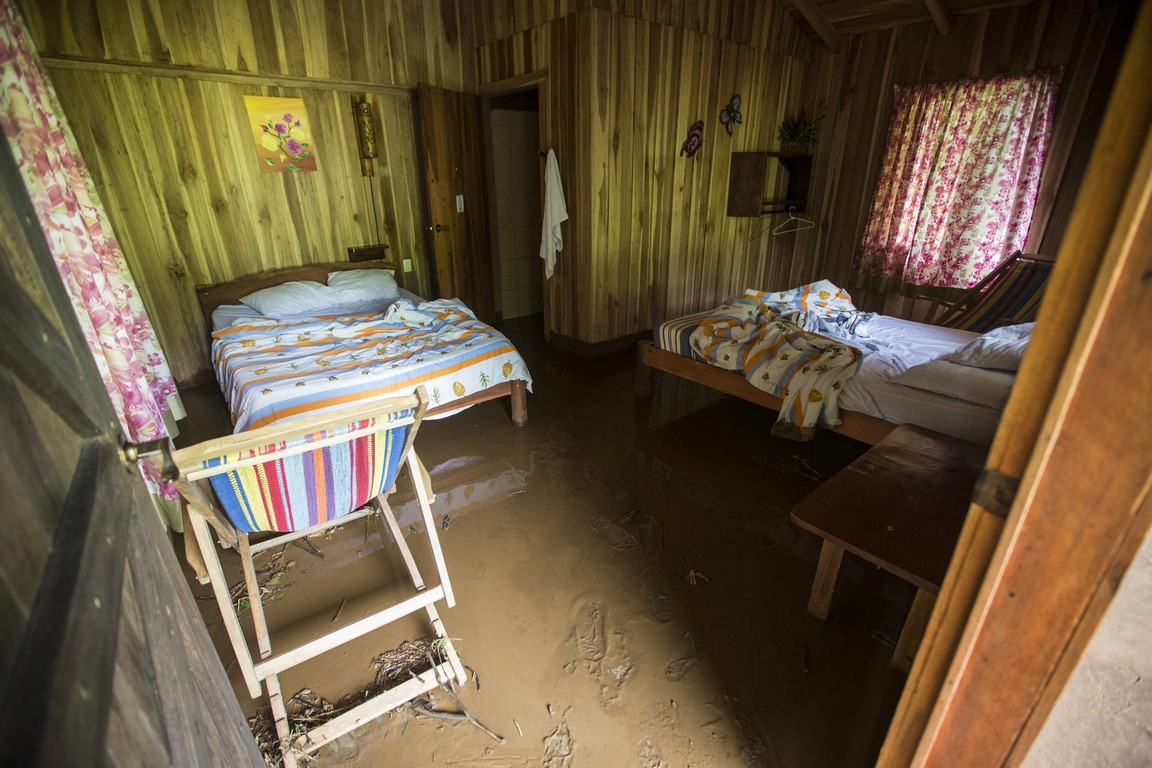 Au petit matin je prends mon appareil photo pour aller observer l’étendue des dégâts. La vision est apocalyptique, la rivière est sortie de son lit, elle est arrivée à 3 mètres du chalet où nous dormions avant qu’Irwin vienne nous chercher. D’énormes rochers de plusieurs tonnes ont été poussés par les eaux, des arbres de plus de 30 mètres de haut ont été arrachés à la terre et broyés comme du papier mâché, la rivière est encore en crue et des quantités d’eau incroyables dévalent la pente à une vitesse impressionnante. On peut entendre les rochers passer, puis des arbres, des branches, de la boue, la zone est dévastée et la piste n’est guère mieux. Nous sommes coincés. Il nous faut descendre à pied jusqu’au village. Le propriétaire nous a rejoint, nous apprenons alors que l’ouragan a changé de direction dans la nuit et est passé juste au-dessus de nous, on nous dit qu’il est passé en catégorie 3 et son centre a touché la ville d’Upala une vingtaine de kilomètres plus au Nord. Il y a 3 zones très touchés, dont celle de Bijagua où nous nous trouvons.